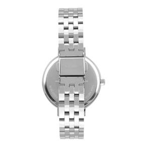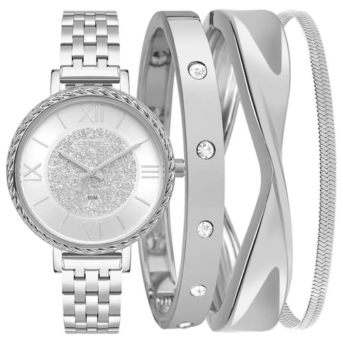 O relógio possui caixa redonda de 40mm com aro trançado em relevo e mostrador com fundo texturizado de glitter prata, garantindo um toque glamouroso e moderno. Os marcadores romanos reforçam a sofisticação do modelo, enquanto a pulseira em aço com elos prateados completa o design com elegância e conforto.