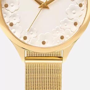 Kit relógio feminino com sistema analógico com ponteiros indicando as horas, minutos e segundos. Caixa em metal com vidro em cristal mineral e pino para ajuste de horas. Mostrador personalizado com flores e indicadores ponteados. Pulseira em aço trabalhado com fechamento por gancho.