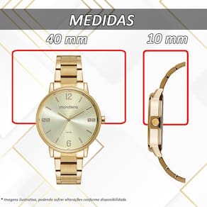 Cor Dourado Formato Redondo Tipo de Tela Analogico Resistência 5 ATM Material do Vidro Cristal Mineral Cor do Mostrador dourado Cor da Pulseira Dourado Tamanho da Caixa 40 mm Espessura da Caixa 10 mm