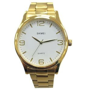 Marca: Skmei Categoria: Analógico Analógico: Sim 1 Horário Ponteiros Fluorescentes: Não Digital: Não Calendário: Não Despertador: Não Mostra o Dia da Semana: Não Mostra o Dia do Mês: Não Cronômetro: Não Contador Regressivo: Não Luz: Não Resistente à Água: 3 ATM Resiste a imersões breves - Respingos: Sim - Chuva: Sim - Lavar Carro: Sim - Lavar Louça: Sim - Natação: Não - Mergulho: Não Característica do Vidro: Cristal Mineral Tipo de Fecho: Dobrável com Botão Cor da Caixa: Dourado Material da Caixa: Metal Banho IP Formato da Caixa: Redondo Diâmetro da Caixa: 39,00 mm Espessura da Caixa: 9,00 mm Cor da Pulseira: Dourado Material da Pulseira: Metal Largura da Pulseira: 18,00 mm Comprimento Máximo da Pulseira: 230,00 mm Alimentação: Bateria Interna Peso Líquido: 0,870 Kg Modelo: SK004 Cor Predominante: Dourado Garantia: 12 Meses