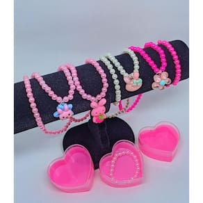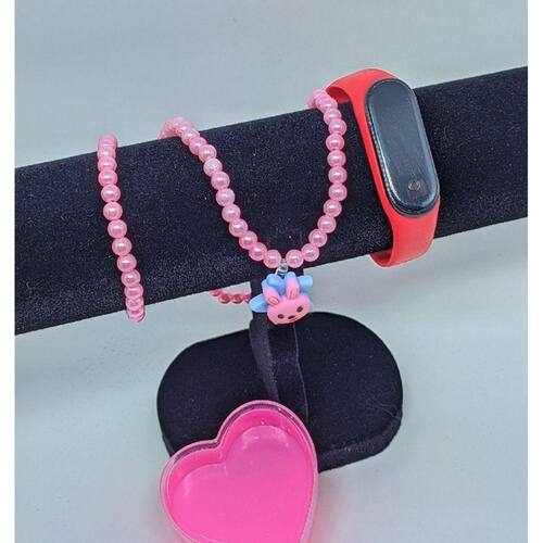 Kit Relógio Infantil Digital Led Bracelete Prova água Menina + Colar Pulseira Miçangas Pingente Urso Coelho Flor - Cor: Vermelho