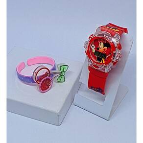 Kit Relógio Infantil Digital Pisca Luz Toca Musica Princesas Disney Minnie Barbie + Pulseira Bracelete 3D Colorida - Cor: Minnie
