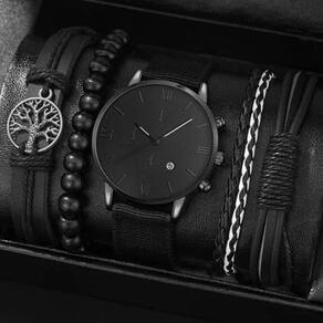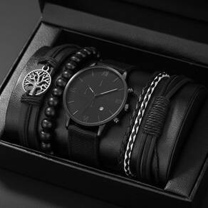 Kit masculino completo no estilo all black, composto por relógio analógico totalmente preto e três pulseiras modernas em couro sintético e contas. O relógio possui mostrador minimalista com algarismos romanos, trazendo um visual elegante e sofisticado. As pulseiras incluem detalhes trançados, contas pretas e pingente de árvore da vida, criando um conjunto estiloso e marcante. Ideal para presentear ou complementar looks casuais e sociais.