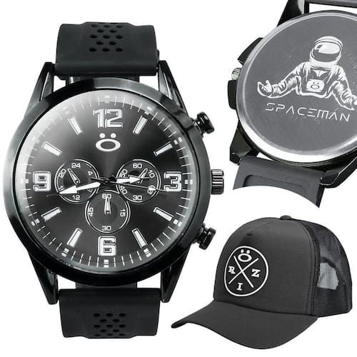 O Kit Relógio Masculino Analógico Boné Preto Presente é perfeito para quem busca um visual moderno e espacial. Composto por um relógio analógico Orizom Spaceman preto e um boné estilo trucker com redinha, este kit é ideal para impressionar com estilo.