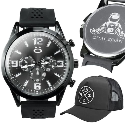 O Kit Relógio Masculino Analógico Boné Preto Presente é perfeito para quem busca um visual moderno e espacial. Composto por um relógio analógico Orizom Spaceman preto e um boné estilo trucker com redinha, este kit é ideal para impressionar com estilo. O relógio analógico Orizom Spaceman possui pulseira em silicone ajustável, proporcionando conforto e um encaixe personalizado. Sua combinação de elegância e modernidade é perfeita para quem procura um visual contemporâneo. O boné preto Orizom Spaceman estilo trucker apresenta o icônico logotipo da marca e é complementado por uma redinha na parte de trás. Além disso, é ajustável para garantir o ajuste perfeito. Este conjunto oferece estilo e versatilidade, sendo ideal para uso pessoal ou como presente para alguém especial. O Kit Relógio Masculino Analógico Boné Preto Presente é perfeito para diversas ocasiões, como dia dos pais, dia das mães, dia dos namorados, aniversários, trabalho, faculdade e muito mais. Garanta já o seu kit Orizom Spaceman e tenha um visual único e cheio de personalidade. Com de 3 meses, você pode ter a certeza de adquirir um produto de qualidade. Não perca essa oportunidade e adquira agora mesmo o Kit Relógio Masculino Analógico Boné Preto Presente. Marca: Não Informado