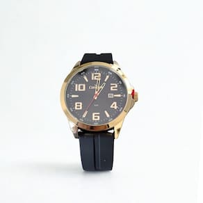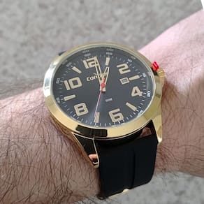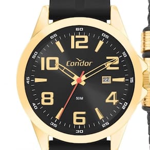 A coleção Drive faz sucesso na Condor. Dessa vez, seu lançamento traz relógios com pulseira de silicone preta e banho dourado. Seu mostrador é preto e possui contador de minutos, segundo e com detalhe de cor e calendário em 3h.