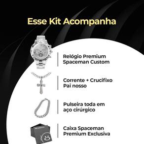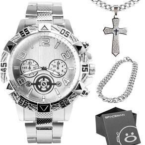 Kit Elegante Masculino Prata - Relógio, Corrente, Pulseira e Caixa PremiumChegou a hora de elevar o seu estilo com este incrível kit masculino. O relógio prata à prova d'água é um verdadeiro destaque, feito de aço inoxidável durável e com um design deslumbrante. A corrente de aço inoxidável com pingente em forma de cruz adiciona um toque de sofisticação e fé ao seu visual. Além disso, a pulseira grumet completa o conjunto com seu design clássico e qualidade premium.E para garantir que você ou a pessoa especial que receberá este presente único tenha uma experiência inesquecível, o kit é apresentado em uma caixa ultra premium. Ideal para presentear alguém especial ou simplesmente para se presentear com estilo.Não perca a oportunidade de investir em um visual completo e elegante para diversas ocasiões. Adquira este conjunto impressionante e adicione um toque de luxo à sua vida!
