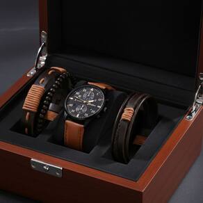 Kit masculino composto por relógio analógico com pulseira marrom e três pulseiras estilosas em couro sintético e contas. O relógio possui mostrador preto com marcadores claros, trazendo um visual moderno e marcante. As pulseiras complementam o look com um toque rústico e sofisticado. Ideal para presentear ou elevar o estilo em ocasiões casuais ou sociais.