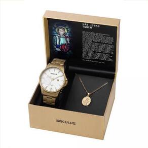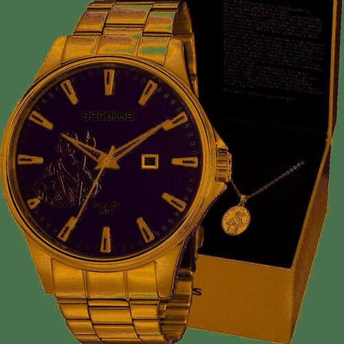 Kit Relógio Masculino Seculus Coleção Fé 35014Gpskda1K1 São Judas Tadeu Kit relógio masculino seculus coleção fé 35014GPSKDA1K1 analógico, pulseira em aço dourado, mostrador prata em relevo, corrente e pingente dourados, estojo especial com a oração de são judas tadeu Caixa: aço Altura caixa: 0,8 cm Cor caixa: dourado Pulseira: aço Comprimento aproximado pulseira: 21 cm Cor pulseira: dourado Peso: 312 grs Função: analógico Visor: cristal mineral Tamanho aproximado da caixa: 4,6 - considerado tamanho grande Resistência a água: 5 atm (50 metros) (permite uso durante o banho ou atividades de natação ou hidroginástica)