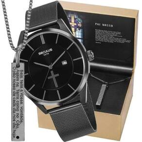 Relógio Seculus Masculino Aço Preto Kit Pai Nosso 20769GPSKPA1K1 Linha Fé Seculus Descritivo técnico - Relógio todo em Aço Preto inoxidável - Composição do Vidro: Cristal Mineral - Largura da Caixa: 48MM - Espessura da Caixa: 9MM - Calendário com dias do mês - Cola com pingente preto em Oração nos 4 Lados Resistência a Água 5 ATM - Pode Lavar as Mãos: Sim - Pode Usar em Água Corrente: Sim - Pode Usar na Piscina: Não recomendo Acompanha a embalagem - 1 Relógio Seculus Masculino Aço Preto Kit Pai Nosso 20769GPSKPA1K1 - 1 Estojo original - 1 Manual e certificado de garantia - 1 Cola com pingente preto em Oração nos 4 Lados - 1 Nota fiscal Garantia de 2 Anos em toda rede nacional Seculus.