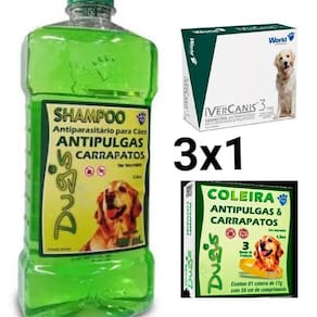 Kit com 3 produtos 1 Shampoo dugs 500ml 1 coleira dugs 1 ivercanis 3mg Remedio antipulga,carrapato e sarnas top ação rapida Olá tudo bem.Parabéns nesta compra você ganha um shampoo antipulgas e carrapatos pra proteger ainda mais sua criação e toda sua casa. Você que tem sofrido e tem visto seu super amigo em apuros. Coceira carrapatos caidos até no chão. Pulgas no meio dos pelos. Ixi. Compre já este poderoso antiparasitico exterminador de Pulgas sarnas e carrapatos. Este comprimido faz efeito em cães de até 15 kilos em raças menores é nessessario partir o remédio para que possa ser dado em cães de 1 a 7 kilos caso esteja com infestação compre já e comece a exterminar esses parasitas imundos da sua casa imediatamente COMPRIMIDOS Tem indicação na bula para que repita de 7 em 7 dias vem com 4 comprimidos para cães ate 15 kg podendo ser partido e mais vezes prolongando o tratamento. Após finalizado o número de comprimidos o efeito sera continuo pois age na corrente sanguínea podendo deixar seu ambiente ainda melhor sem pulgas por meses se corretamente. A COLEIRA Pode ser Utilizado em todas as raças de cães pequenos ou grandes com duração top de 3 meses sua casa estara ainda mais protegida com essa blindagem antipulgas que você esta prestes a adquirir. SHAMPOO Marca: Não Informado Ean: 7909463402174