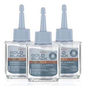 Reparador Amend Gold Black Nutritive forma uma película protetora em volta dos fios que condiciona, doa brilho, maciez e repara as pontas duplas e ressecadas.