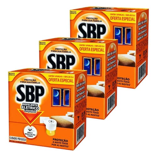 Kit repelente liquido sbp elétrico 45 noites 3 aparelhos + 3 refis de 35ml Kit com: 3 caixas de repelente sbp elétrico com 3 aparelhos + 3 refis líquido de 35ml ======================================== Sobre o aparelho repelente sbp 45 noites elétrico com refil liquido 35ml