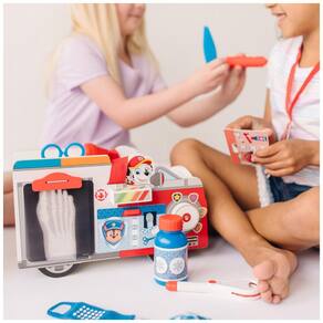 O transportador de madeira em forma de caminhão de resgate Marshalls PAW Patrol é um conjunto de primeiros socorros com 14 peças essenciais para qualquer missão de resgate. Com um cartão de missão preso na lateral do transportador, as crianças podem virar o bloco para mostrar o nível de emergência e girar o botão para escolher o crachá de um filhote para ajudar. As ferramentas EMT incluem um termômetro rolante, uma seringa, um frasco de remédio, bandagens, pinças, tesouras e um tubo de pomada. O conjunto também vem com clipes de raio X presos na lateral do transportador para que as crianças possam escolher o ajudante de Marshall e as ferramentas necessárias para a próxima missão de resgate. Com uma alça de transporte conveniente, este conjunto é um ótimo presente para crianças em idade pré escolar, de 3 a 5 anos, para brincadeiras práticas e sem tela. A Patrulha Canina está sempre pronta para ajudar, inspirando crianças em idade pré escolar com uma mistura de trabalho em equipe, aventura e humor à medida que desenvolvem habilidades sociais, emocionais e de desenvolvimento através da brincadeira.