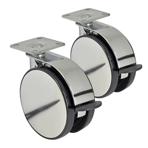 Rodizio em zamac ø80mm design marcante e inovador roda preta calota cromada capa cromada valor da peça diâmetro: 96mm capacidade de carga: 60 kg altura total: 109mm fixação: chapa plana sugestões de aplicação: cachepôs, suporte de vasos, racks, estantes, estantes, puffes, gaveteiros, mesa de cabeceira, armários, gabinetes, carrinhos de chá, bar, mesas de centro e móveis em geral.