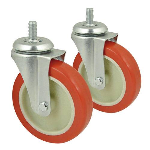Rodizio industrial Roda da linha pesada Ø125mm com pino rosca 1/2polegadas x 26 Anti risco Roda na cor laranjaValor do kit de 2 peçasDiâmetro: 125mmCapacidade de Carga: 105 KgAltura Total: 150mmFixação: pino rosca 1/2 x 26Sugestões de Aplicação:Mesas, armários para ferramentas, fornos, buffets, assadeiras, cozinhas industriais, carrinhos industriais, linha de refrigeração, equipamentos industriais, balcões frigoríficos, refrigeradores, expositores, gôndolas, nobreaks, estabilizadores.
