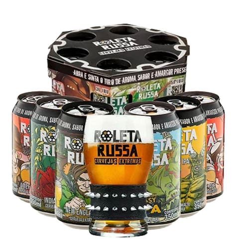 Este kit é composto pelas seguintes cervejas: 1 Cerveja Roleta Russa Easy IPA lata 350ml 2 Cerveja Roleta Russa Apa lata 350ml 1 Cerveja Roleta Russa India Pale Ale IPA lata 350ml 1 Cerveja Roleta Russa New England IPA lata 350ml 1 Cerveja Roleta Russa Imperial IPA lata 350ml 1 Copo personalizado Roleta Russa com pulseira