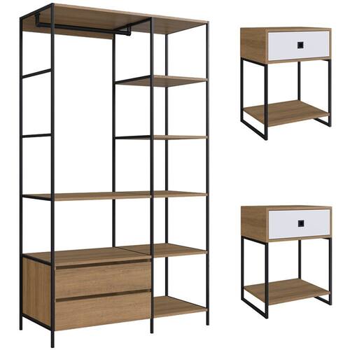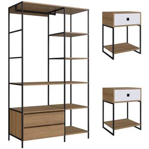 Kit Roupeiro E 02 Mesas De Cabeceira Estilo Industrial 1025X1026, é o conjunto perfeito para acrescentar conceitualidade e conforto ao seu quarto, com seu estilo atemporal, irá decorar seu ambiente de forma surpreendente! Estrutura em Metal e MDP de 15 mm e texturas exclusivas. O Roupeiro conta com 02 gavetas com frente passante, 05 prateleiras e um cabideiro em metal. As Mesas De Cabeceira possuem gaveta com puxadores embutidos e prateleira inferior, ambos possuem corrediças metálicas e ponteiras plásticas para evitar riscos no chão de seu cômodo. Tudo elaborado com materiais de qualidade, requinte e bom gosto. O Roupeiro suporta até 40 kg distribuídos, as mesas de cabeceira 15 kg, cada. Estes móveis chegarão na sua casa separados em 03 volumes.