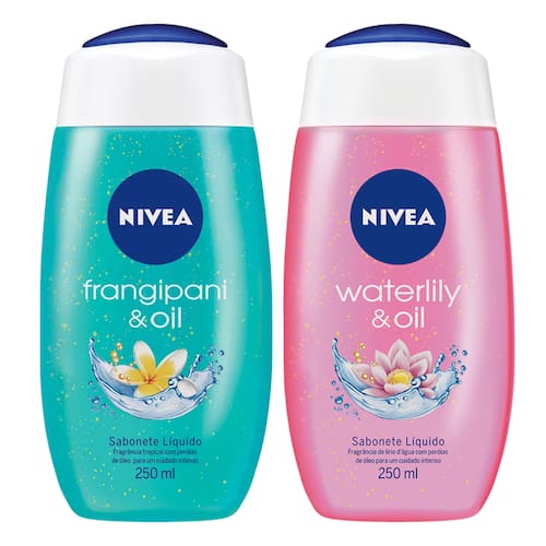 O kit é composto por: 1 Sabonete Nívea Water Lily & Oil Líquido 250ml 1 Sabonete Nívea Frangipani & Oil Líquido 250ml