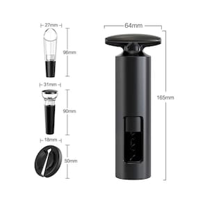 Medidas: - Saca Rolhas: 16cm de altura, e 4,1cm de largura e 6,4cm de comprimento; - Cortador de Cápsulas: 0,5cm d altura e 5cm de diâmetro; - Pouper: 9,6cm de altura e 2,7cm de diâmetro; - Rolha de Vácuo: 9cm de altura e 3,1cm de diâmetro.