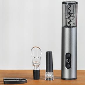 Kit Saca Rolhas Elétrico 4 Peças para Vinho Cinza - Rolha à Vácuo, Aerador de Vinho, Cortador de Lacre, Saca Rolhas Elétrico