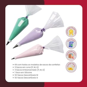 Características Gerais do produto Kit cometros metrosangas para confeitar emetrosborrachadas (P, M, G), emetros lona (P, M, G), sacos descartáveis (50 unidades grande, 50 unidades metrosédia) e metrosanga emetros silicone. Ideal para iniciantes e renovação de utensílios de cozinha.