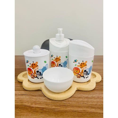 Kit Organizador para bebê c/bandeja em MDF. Cor do Pote: BRANCO PADRÃO Tampas: BRANCO MATERIAL DOS POTES: ACRÍLICO MATERIAL DA BANDEJA: MDF Kit acompanha: - 1 bandeja de madeira em MDF. - 1 porta sabonete / álcool gel - 1 molheira - 1 porta algodão - 1 porta cotonete MEDIDAS DA BANDEJA EM MDF: Diâmetro: 19,5x19 cm Altura: 5x8cm MEDIDA DOS POTES: Porta algodão/cotonete: 8x10,5 cm Porta sabonete líquido: 12x21 cm Molheira: 8x5 cm Marca: Doya Kids