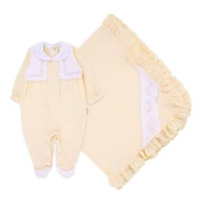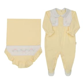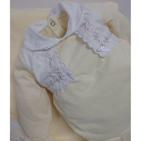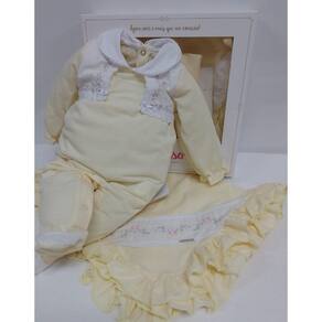 Características do Produto: - Macacão em malha trabalhada, super macia e confortável. Detalhe na parte superior pala em tecido com bordado floral que imita um casaquinho, que dão um charme todo especial a peça. Detalhe de rendinha nos punhos. Gola redonda em tecido com rendado. Punhos com elástico. Abertura nas costas até o meio e entre pernas por pressão. Simplesmente um encanto! - Manta também em malha trabalhada. Detalhes de bordado e plaquinha da marca aplicada. Babadinhos no contorno. Medidas aproximadas da manta: 70cm x 80cm. A Saída Maternidade Meia Estação combina conforto e sofisticação, sendo perfeita para ocasiões especiais, destacando a elegância e o charme da sua pequena princesa.