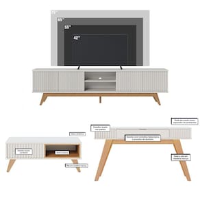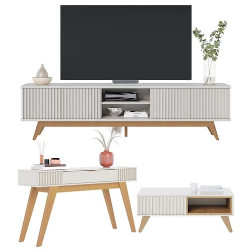 O Kit Completo de Rack para TV Fortaleza, Mesa de Centro Jeri e o Aparador Riviera combina sofisticação e funcionalidade, trazendo móveis de design exclusivo e alta qualidade. Com estrutura produzida com materiais de excelente qualidade e acabamento em pintura UV, este conjunto é ideal para quem busca um ambiente moderno e elegante. O Rack, ideal para TVs de até 75 polegadas, possui portas com detalhe ripado artesanal, prateleira e nichos amplos, com pés de madeira maciça. O Aparador vem com gaveta de corrediças telescópicas e puxador dourado fosco, além de pés em madeira maciça, proporcionando robustez e requinte. A Mesa de Centro completa o conjunto com detalhe ripado e nicho interno. Transforme seu ambiente com o Kit Sala, perfeito para quem preza por estilo e funcionalidade em cada detalhe.