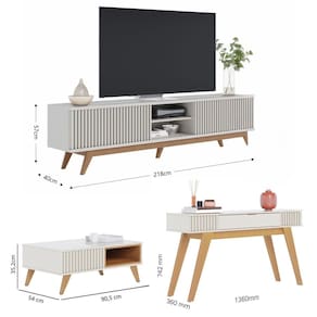 INFORMAÇÕES TÉCNICAS KIT: 1 x RACK: Alt. 57cm Larg. 218cm Prof. 40cm P. 55,85kg 1 x APARADOR: Alt. 74,2cm Larg. 136cm Prof. 36cm P. 24,27kg 1 x MESA DE CENTRO: Alt. 35,2cm Larg. 90,5cm Prof. 54cm P. 23,1kg