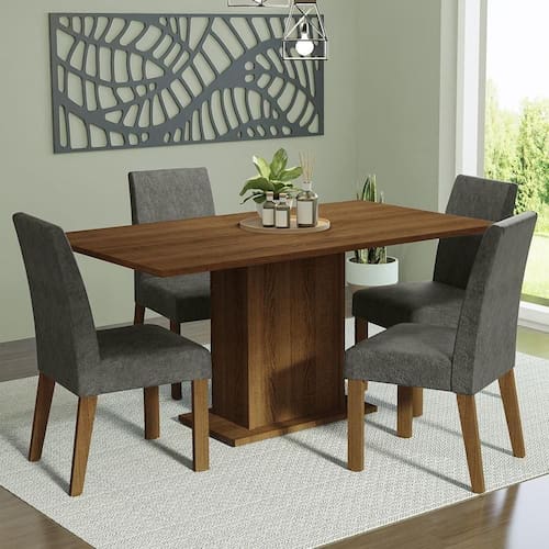 Itens incls: - Uma (1) mesa com base pedestal e tampo retangular em MDP - Quatro (4) cadeiras estofadas