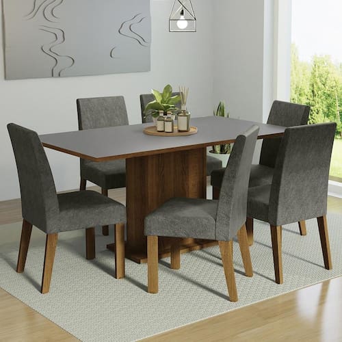 Itens inclusos: - Uma (1) mesa com base pedestal e tampo retangular em MDP - Seis (6) cadeiras estofadas