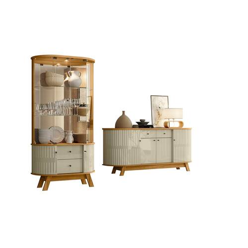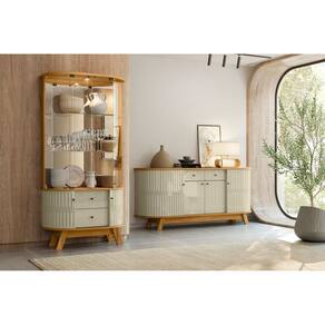 O Buffet Mônaco oferece excelente espaço interno com 4 portas, 2 gavetas e 3 prateleiras, sendo perfeito para manter tudo organizado no dia a dia. Já a Cristaleira Moss conta com portas de vidro deslizantes, prateleiras de vidro, espelhos e iluminação em LED, valorizando suas peças e trazendo destaque ao ambiente.