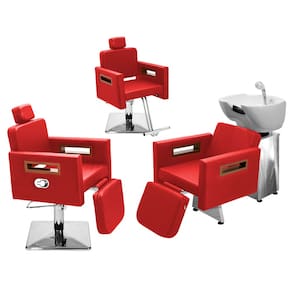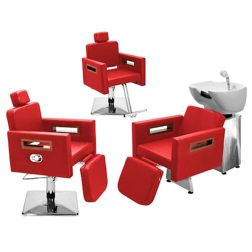 Kit Salão de Beleza 1 Cadeira Fixa + 1 Reclinável C/Ap Quadrada + 1 Lavatório C/Ap Base Inox Tunísia - Cor: Vermelho