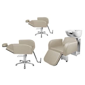- 1 Lavatório Porcelana Destak Com Apoio Base Inox: com um design clean, braços estofados com detalhe arredondado na ponta, espuma de alta densidade, assento amplo e um apoio de pernas estofado com regulagem de altura que proporcionam conforto e comodidade para seu cliente durante a lavagem do cabelo. Cuba de porcelana branca com ajuste de altura e com ducha cromada e registro que tem a função de manocomando, que permite que você altere a temperatura da água sem precisar mexer na chave do aquecedor! Tudo isso com a alta resistência da base de ferro inox!