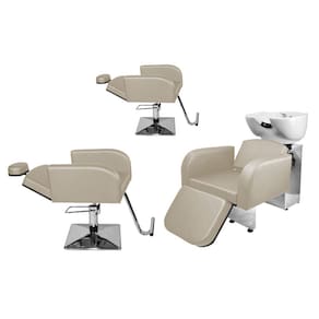 - 1 Lavatório Porcelana Destak Com Apoio Base Inox: com um design clean, braços estofados com detalhe arredondado na ponta, espuma de alta densidade, assento amplo e um apoio de pernas estofado com regulagem de altura que proporcionam conforto e comodidade para seu cliente durante a lavagem do cabelo. Cuba de porcelana branca com ajuste de altura e com ducha cromada e registro que tem a função de manocomando, que permite que você altere a temperatura da água sem precisar mexer na chave do aquecedor! Tudo isso com a alta resistência da base de ferro inox!