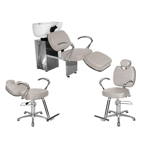 - 1 Cadeira Topázio Fixa Base Estrela: com um design moderno, detalhes em costura no tecido courino, espuma de alta densidade confortável e um assento amplo, cabeçote ajustável e removível, braços tubulares de aço com estofamento, peseira de aço e base hidráulica com trava para o giro. Ideal para cortes, penteados, escova e prancha!