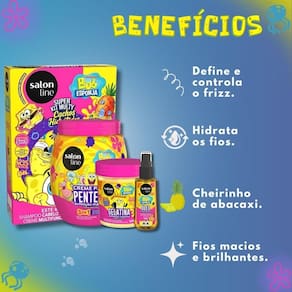 Este conjunto foi formulado para atender às necessidades dos cabelos cacheados infantis, proporcionando hidratação, definição e desembaraço, enquanto garante um cuidado suave e seguro. Com o Kit Salon Line Kids Bob Esponja, os cachinhos dos pequenos ficarão saudáveis, macios e cheios de vida, com um toque de diversão.