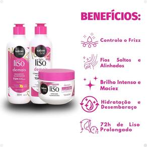 O Kit Salon Line Meu Liso Demais Alinhador é a solução ideal para quem busca cabelos lisos, alinhados e livres do frizz. Composta por shampoo, condicionador e creme de tratamento, essa linha proporciona cuidados completos para um liso impecável e duradouro. O shampoo limpa suavemente os fios enquanto combate o frizz, preparando os cabelos para o tratamento intensivo. Sua fórmula suave e eficaz mantém os fios hidratados e disciplinados desde a primeira lavagem. O condicionador hidrata profundamente, selando a cutícula capilar e proporcionando maciez, brilho e um alisamento natural. Ele facilita o desembaraço e garante fios mais sedosos e alinhados. O creme de tratamento proporciona uma hidratação intensiva, nutrindo os fios e deixando-os ainda mais lisos e livres do frizz. Sua fórmula contém ativos que promovem a restauração da estrutura capilar, dando aos cabelos um efeito liso por mais tempo. Este kit é ideal para quem busca um tratamento completo que alinha, hidrata e protege os fios. Com o Kit Meu Liso Demais Alinhador, seus cabelos ficam mais sedosos, disciplinados e com aquele brilho saudável, prontos para arrasar o dia todo.