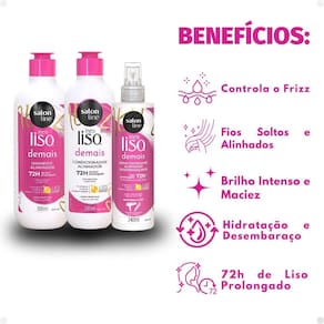 O Kit Salon Line Meu Liso Demais Alinhador é a escolha perfeita para quem deseja cabelos lisos, disciplinados e sem frizz. Composto por Shampoo 300ml, Condicionador 200ml e Spray Defrizante Desembaraçante 200ml, esse kit proporciona um cuidado completo para fios mais alinhados, macios e protegidos. O shampoo limpa suavemente os fios enquanto controla o frizz e prepara o cabelo para um alisamento suave. Sua fórmula eficaz mantém os fios hidratados e disciplinados desde a primeira aplicação. O condicionador hidrata profundamente, selando as cutículas capilares e proporcionando brilho intenso e maciez. O condicionador ajuda a manter o alisamento por mais tempo e deixa os fios mais sedosos e fáceis de desembaraçar. O spray defrizante desembaraçante proporciona proteção térmica contra o calor de secadores e chapinhas, além de ajudar a desembaraçar os fios e controlar o frizz. O spray deixa o cabelo mais alinhado, sem pesar, e garante um efeito liso e duradouro. Este kit foi desenvolvido para cabelos lisos, alisados ou em processo de alisamento, oferecendo cuidados diários que alinham, hidratam e protegem os fios. Com o Kit Meu Liso Demais Alinhador, seus cabelos ficam mais suaves, controlados e com aquele brilho saudável, prontos para encarar o dia com confiança.