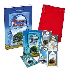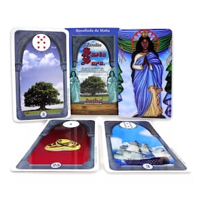 São 36 cartas coloridas nos dois lados, no verso a figura da Santa Sara. Manual com significado de cada carta, rituais e instruções para o jogo.
