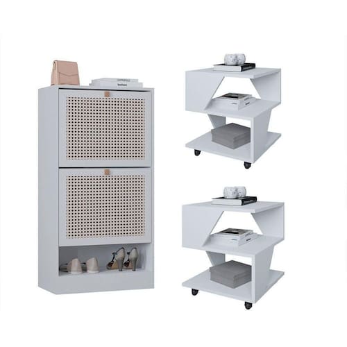 Design contemporaneo e cores modernas Estrutura em BP resistente e duravel Mesas com rodizios para facil movimentacao Sapateira com portas 3D imitando palha indiana Facil de montar produtos enviados desmontados