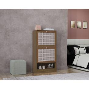A Sapateira Tropical, com design vertical e portas com pintura 3D que imita palha indiana, oferece um toque sofisticado para o ambiente, sendo perfeita para organizar sapatos em quartos, closets ou lavanderias.