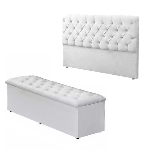 linda Conjunto Sapateira Baú E Cabeceira E Box Casal em Corino Branco. Ideal para quem busca modernidade para o quarto e espaço para guardar cobertores, roupas de cama, travesseiros, entre outros. Recomendado para cama casal padrão 1.38m x 1.88m.