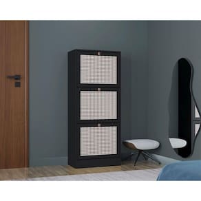 A Sapateira Tropical, com design vertical e portas com pintura 3D que imita palha indiana, oferece um toque sofisticado para o ambiente, sendo perfeita para organizar sapatos em quartos, closets ou lavanderias.