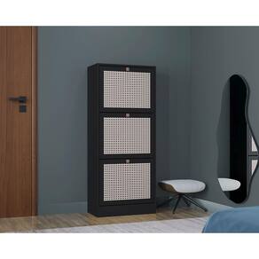 A Sapateira Tropical, com design vertical e portas com pintura 3D que imita palha indiana, oferece um toque sofisticado para o ambiente, sendo perfeita para organizar sapatos em quartos, closets ou lavanderias.
