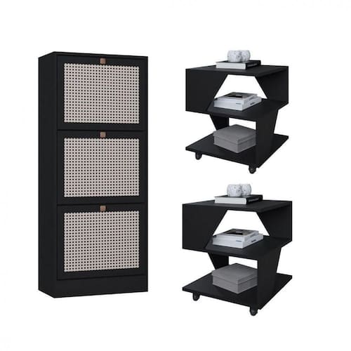 Destaques: Design contemporaneo e cores modernas Estrutura em BP resistente e duravel Mesas com rodizios para facil movimentacao Sapateira com portas 3D imitando palha indiana Facil de montar produtos enviados desmontados