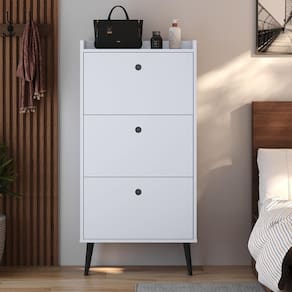 A Sapateira Dark conta com três gavetas basculantes, tornando o acesso aos calçados fácil e prático, já que a gaveta se inclina para baixo quando aberta, permitindo que você visualize e retire os sapatos com facilidade.