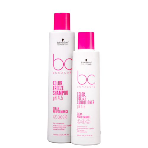 Kit com shampoo e condicionador para cabelos coloridos. Schwarzkopf Professional BC Bonacure Clean Performance Color Freeze Dupla tem pH 4.5 que reequilibra a estrutura do cabelo para um nível de pH ideal, além de proteger a cor dos fios, evitando o desbotamento.