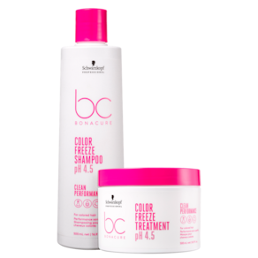 Kit com shampoo e máscara para cabelos coloridos em tamanho profissional. Schwarzkopf Professional BC Bonacure Clean Performance Color Freeze Profissional tem pH 4.5 que reequilibra a estrutura do cabelo para um nível de pH ideal, além de proteger a cor dos fios, evitando o desbotamento.